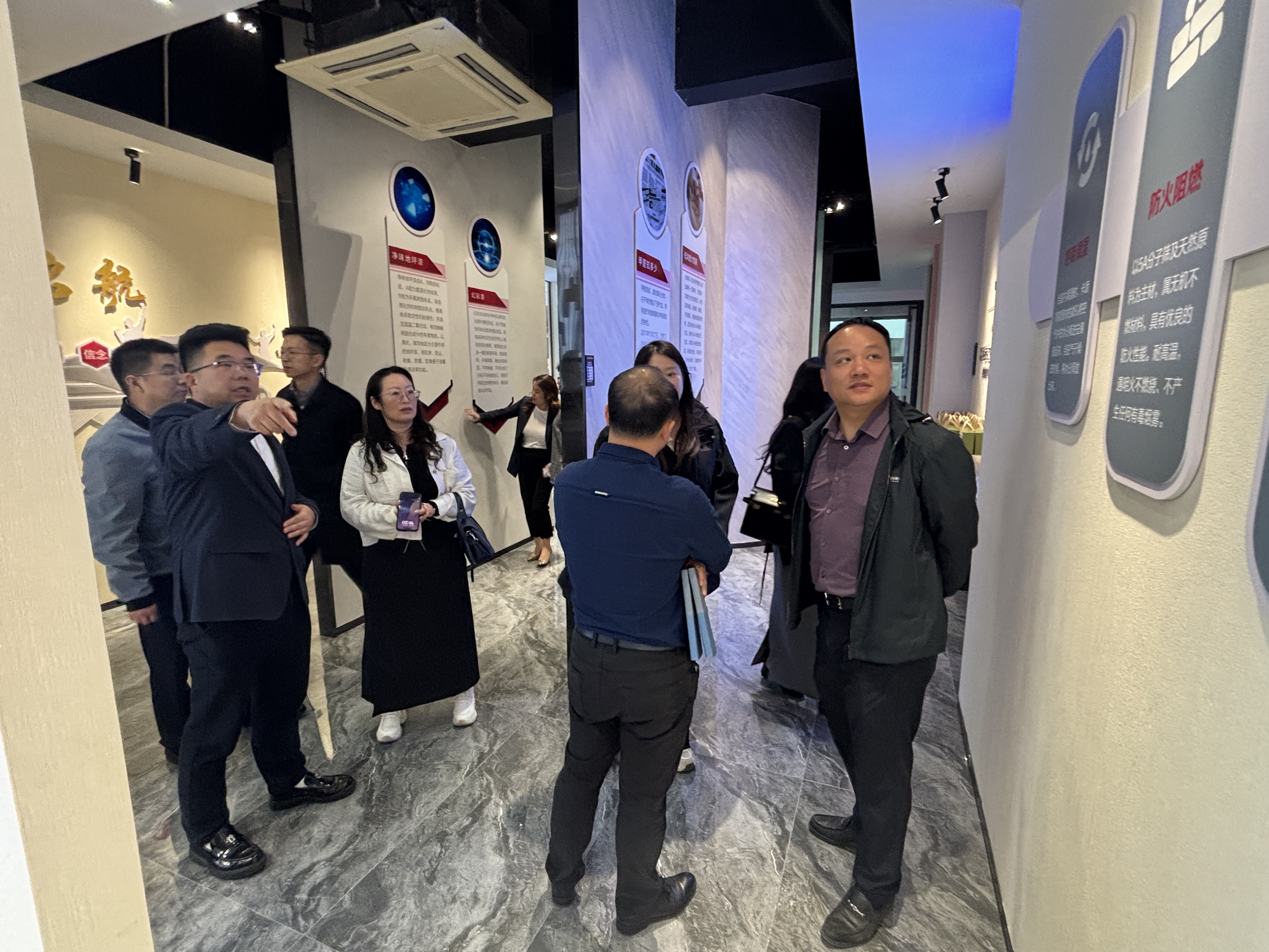 会后,代表团前往卡颂智能壁材有限公司参观,深入了解其自主研发的智能环保壁材产品。卡颂公司负责人展示了壁材在净化空气、调节湿度及低碳环保方面的技术突破,获得代表团的高度评价。